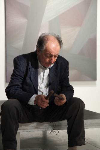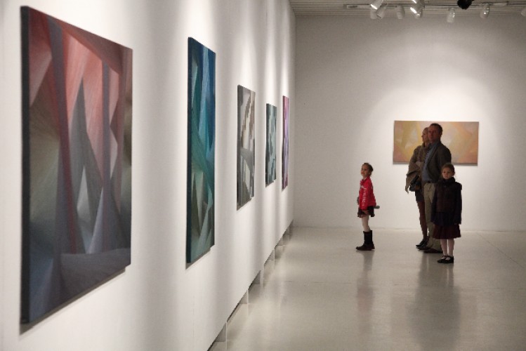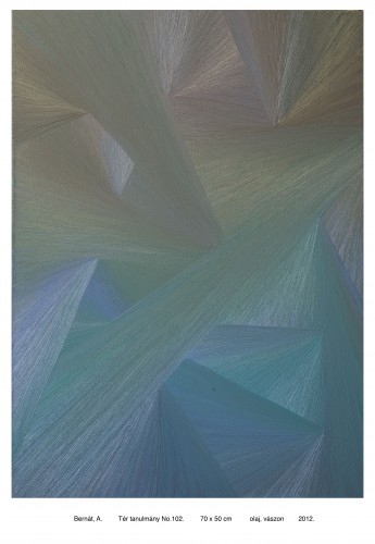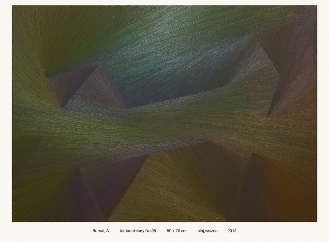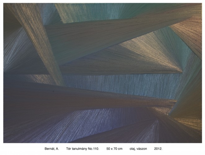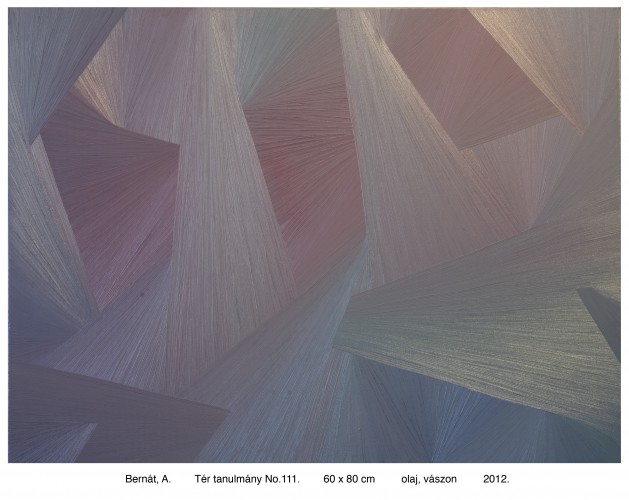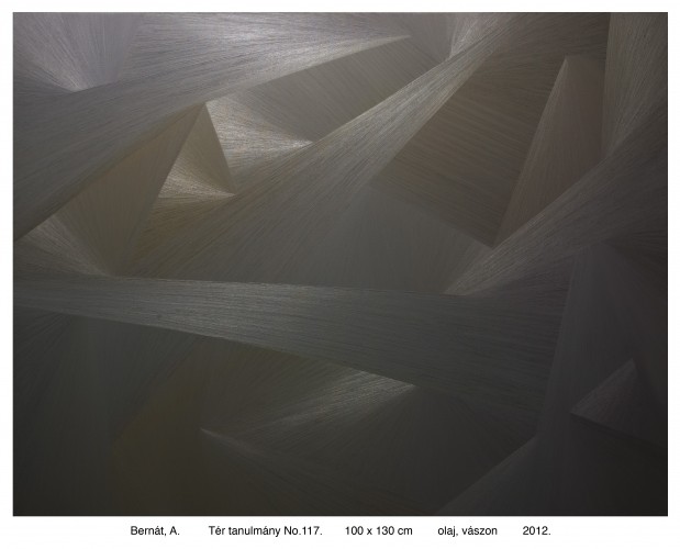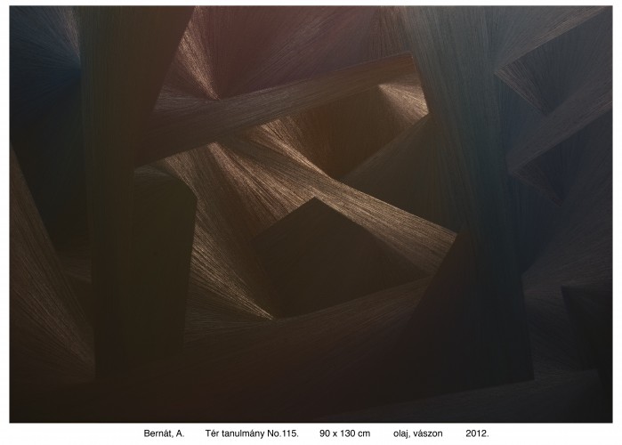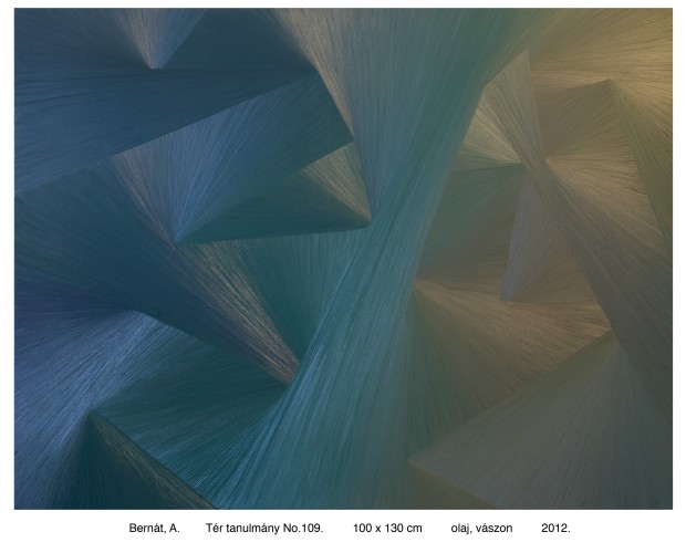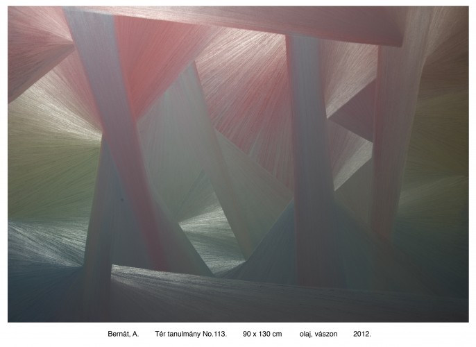 Bernát András mostani kiállításán a 2010-ben elkezdett tértanulmányaiból mutat be festményeket. A leginkább a kristályok szerkezetére emlékeztető képi struktúrák a ’80-as évek második felében festett térábrázolások és az Objektum-sorozat esszenciáinak is tekinthetők.