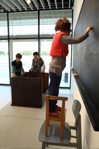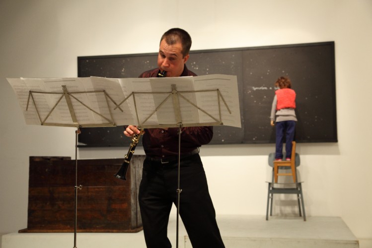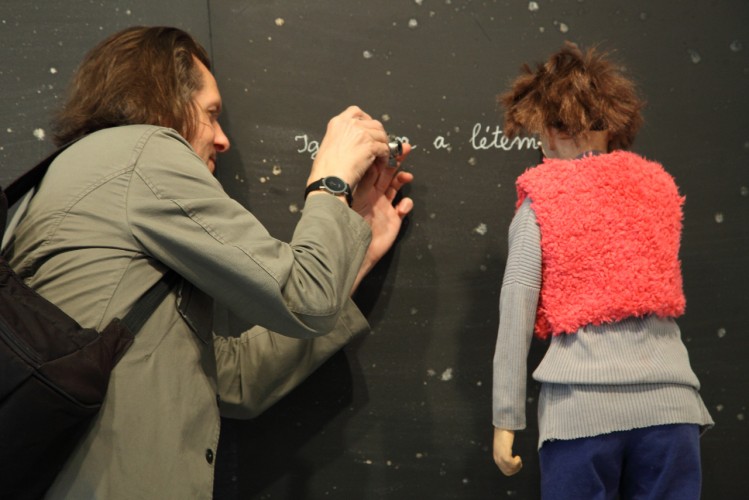 A nagy bábu sem néz ide, a gyorsan hömpölygő Dunát látja, bámul bele a vízbe. A kis önportré a táblát nézi a saját felirattal, a menetekellel, nem látja a képeket, tudja őket kívülről. Ezek a bábuk egyszerre érzékenyek és érzéketlenek – ők így hárman, mert ott van még a fekete puttonyos alak, Ottfried is – mindent tudnak és éreznek, de nem sírnak, nem mozdulnak, legfeljebb elmúlnak vagy eltűnnek.