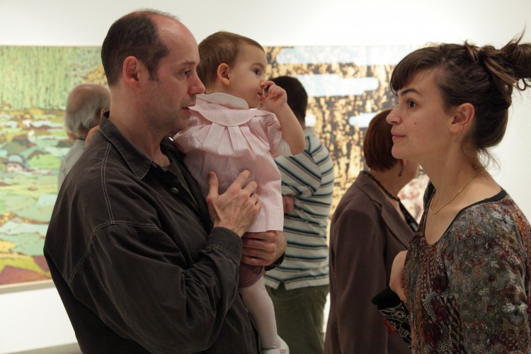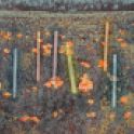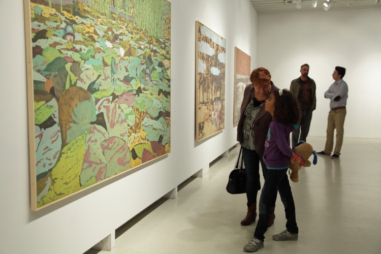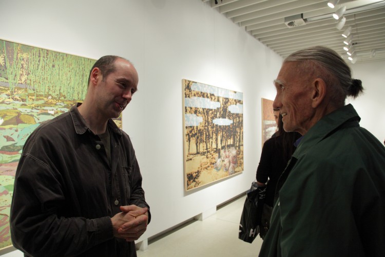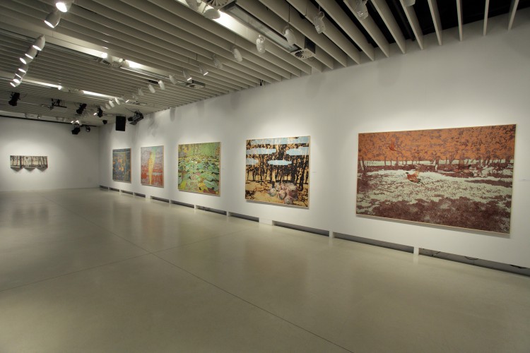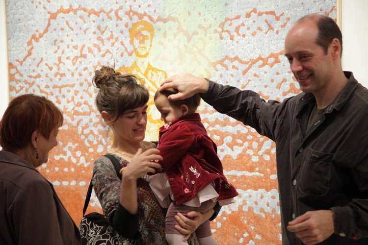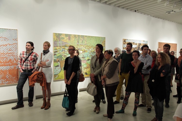 Valahol. A mostani kiállítás címe térbeliségre, valamely területre, vidékre utal, és teszi ezt a bizonytalanság, a keresés-kutatás érzetét keltve. Nagyvárosi tájképfestészet ez, áthatva a történelem lenyomataival. Leginkább egy militáns Monet-t képzeljünk el, aki a tavirózsák között felbukkanó hadi sisakokat megpillantva elhagyja az impresszionisták derűjét, és technikát vált.