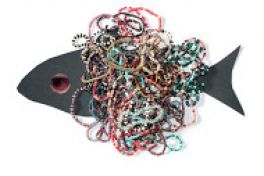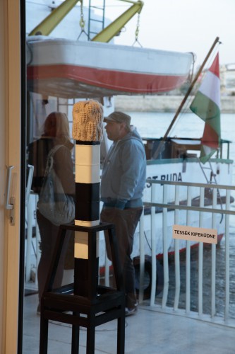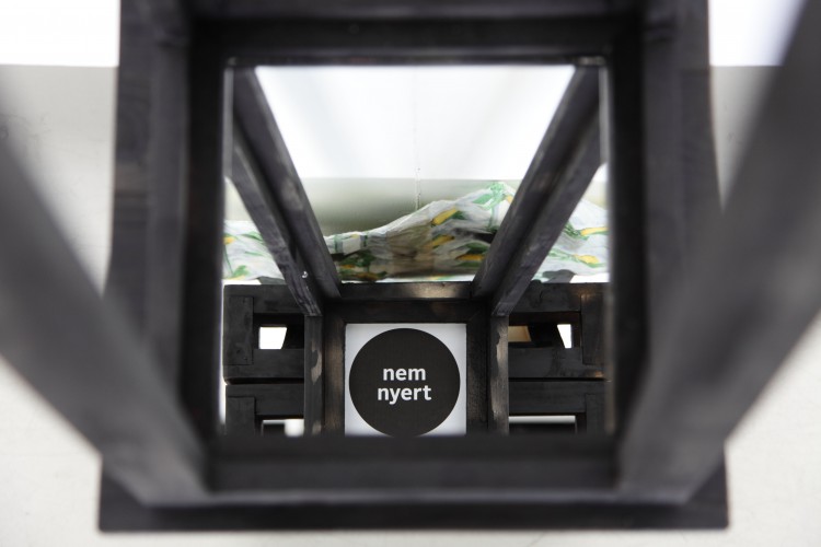 A kiállításon szereplő egyik művön Laca cipőit látjuk, közöttük olcsó gyöngykarkötők, és a szétírt home-oszt-ázis felirat.