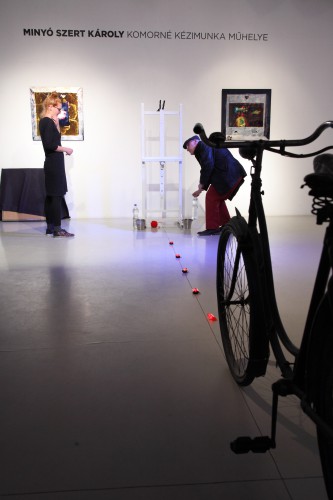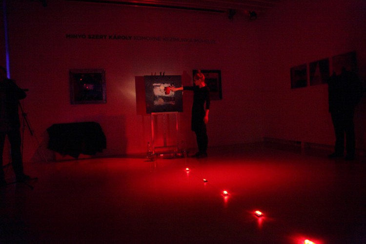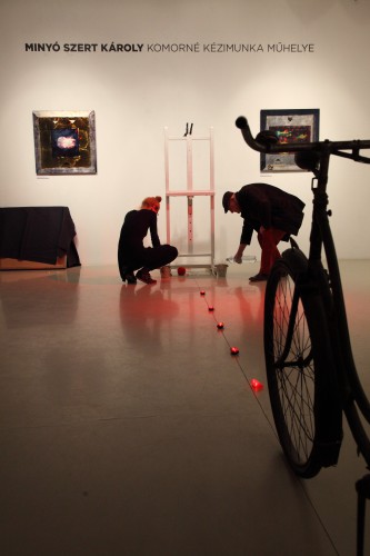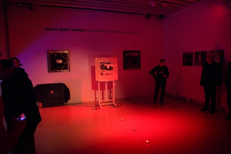 „Komorné Kézimunka Műhelye valós szolgáltató egység volt, a Régiposta utca 7-9. félemelet 4-ben működött a 60-as években, és kora ifjúságom alapképleteként minden lépcsőzésnél beexponálódott a fejembe a földszinti kis fekete, aranyszegélyes tábla látványa a fordulóban, ahogy gyerekként kettesével vettem a lépcsőket nagyszüleim házában. Főleg a kiírás zenéje vagyis inkább rigmusa fogott meg. Sok év elteltével az egyszerű, hétköznapi táblácska rigmusa visszatért! A névadóról nincs konkrét emlékem, egy gyermeki fantáziában kibomló kuszaság, valami, ahonnan akkor elrúgtam magam, hogy most megidézzem!”— így vall a művész, Minyó Szert Károly legfrissebb kiállításának címválasztási apropójáról. S ez az emlékfoszlány, illetve felidézésének módja sokat elárul Minyó szemléletéről, alkotási módszeréről, arról, ahogy e „beexponálódások” milyen nemes és rafinált módozatokban kerülnek nála előhívásra, majd milyen ékes és rendhagyó módon nagyításra.