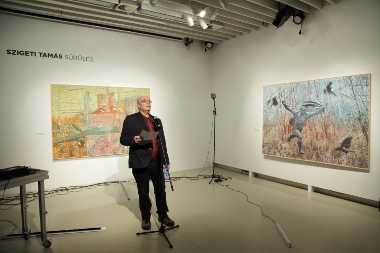 Szigeti Tamás számára képeket festeni egy jó ideje egyet jelent a téralkotással. A texturális kísérletek és a kollázs technikák az új képeken egyszerre utalnak térbeli elhelyezkedésre, az alá- és fölérendeltségi viszonyokra, és utaztatják a szemlélőt a „régen volt”, illetve a „mindez megtörténhet” felvetései mentén. A bódulathoz hasonló állapot, melyet a képek sugallnak, erős párhuzamokat mutat társadalmi/történelmi tudatunk megnyilvánulásaival.