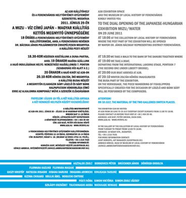 The Japanese and Hungarian collaborative exhibition Mizu / Víz /Water opened on both sides of the river Danube at A38 Exhibition Space and at the Collection of Local History of Ferencváros on 29 June 2011.