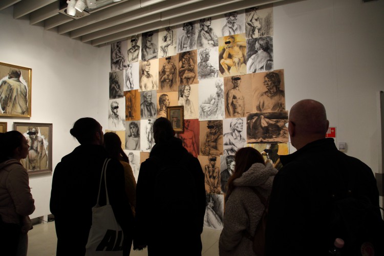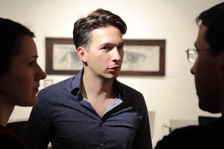 „Megfigyelni, meglesni valamit vagy valakit, nyíltan vagy titkoltan, ahogy a férj figyeli meg a nejét, a fiúgyermek az anyját, a diák a tanárát, a tanár a diákját. Ahogy mindig is vonzóan hívogató tud lenni egy félig leengedett redőny, egy félig behúzott függöny, egy opálosan, gyéren megvilágított jelenet, személyes történet a szemközti ház második emeletén, a lépcsőházban felfelé igyekvő lábak látványa, melyekhez nem tartozik test, arc, csak egy elmosódott mozdulatsor, ugyanakkor annál élesebb ütemes kopogás. Mindez végigkísér minket, megtölti mindennapjainkat, elmosódva, összekuszálódva, vagy épp tűélesen kirajzolódva. Krakkóban, Rómában, a rajziskolában (ahol először volt szabad tudományosan megfigyelni az emberi test részleteit) vagy a pesti gangokon. A kiállításon beleleshetünk az életem korábbi leselkedéseibe is, így láthatunk egy akt rajzokkal betapétázott falat, Krakkóban vagy Rómában készült képeket. A kiállítási anyag nagyobbik hányadát azonban jelenlegi műtermem s az onnan induló kitekintéseim adják.” (Tóth Andrej)